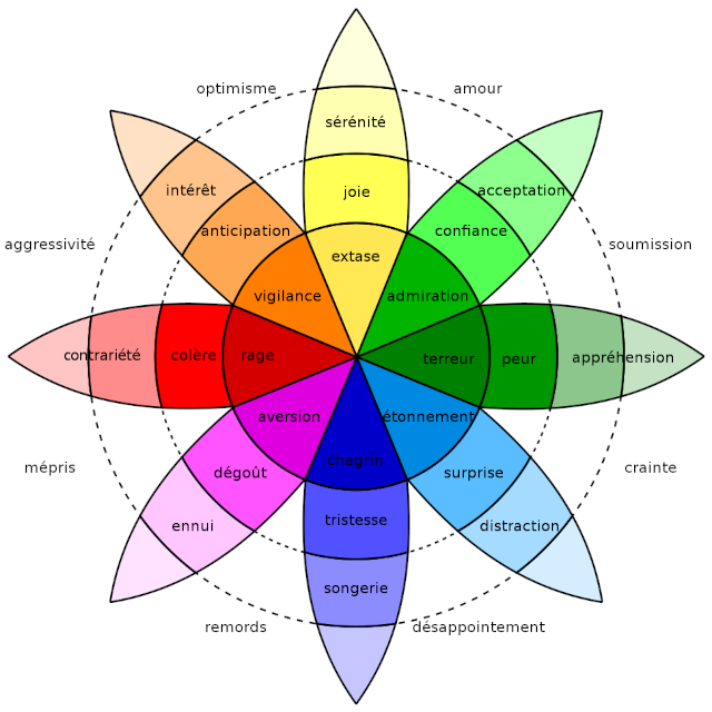D’après lui, les émotions de base peuvent se combiner pour former des émotions dites secondaires, qui sont davantage complexes. Par exemple, la joie et la confiance combinées peuvent donner naissance à l’amour, alors que la peur et la surprise peuvent conduire à la soumission.