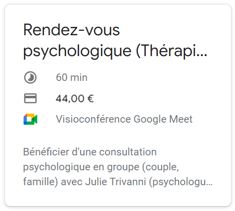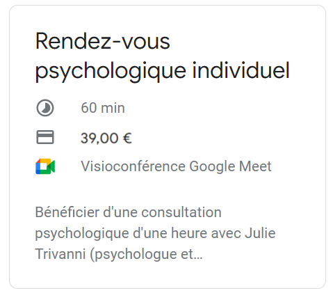 ♦ Note : Si vous avez récemment effectué un paiement pour votre rendez-vous, mais n’avez pas encore reçu de courrier électronique de confirmation, veuillez s’il vous plaît prendre contact avec moi. Adresse e-mail de contact : julietrivanni.psychologue@gmail.com